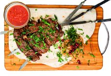 310 г • Шашлык из телятины с курдюком предварительно замаринованный в восточных специях. Готовится на трех шампурах, из-за чего становится еще более сочным и нежным. Подается с маринованным лучком, гранатом и зеленью.
