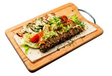 250 г • Рулет из баранины, сыра, томата и огурца. Блюдо дополняется свежейзеленью и лимоном.