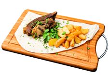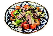 300 г • Фирменный салат с сочным ростюифом из говяжьей вырезки, шампиньонами, сладким перцем помидорами черри, салатным луком, листьями салата айсберг и латук. Заправляется бальзамическим соусом.